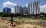 Seorang anak melintas di lahan untuk proyek pembangunan waduk Cawang di Kampung Dalem, Cawang, Jakarta, Rabu (6/4/2022). Dampak dari pembangunan Waduk Cawang membuat pemukiman warga di RT 4 dan RT 5, Kampung Dalem, Cawang, yang lokasinya berada di dekat proyek terendam air karena tersumbatnya aliran saluran air.  (FOTO : Republika/Putra M. Akbar)