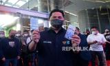 Menteri BUMN Erick Thohir usai peluncuran voucer fisik internet telkomsel dan kartu E-money mandiri dengan desain edisi karakter Bumilangit di Jakarta, Selasa (6/4/2022). Sinergi bersama ini menjadi komitmen nyata dalam mendukung pengembangan industri kreatif di Indonesia. Prayogi/Republika. (FOTO : Prayogi/Republika.)