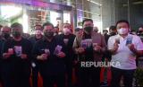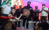 Menteri BUMN Erick Thohir menunjukan jaket dengan gambar karakter Bumilangit saat peluncuran voucer fisik internet telkomsel dan kartu E-money mandiri dengan desain edisi karakter Bumilangit di Jakarta, Selasa (6/4/2022). Sinergi bersama ini menjadi komitmen nyata dalam mendukung pengembangan industri kreatif di Indonesia. Prayogi/Republika. (FOTO : Prayogi/Republika.)