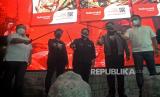 (dari kiri) Komisaris Utama Telkom Indonesia Bambang Brodjonegoro, Direktur Utama Telkomsel Hendri Mulya Syam, Menteri BUMN Erick Thohir, Dirut Bank Mandiri Darmawan Junaidi dan Dirut Telkom Indonesia Ririek Adriansyah saat peluncuran voucer fisik internet telkomsel dan kartu E-money mandiri dengan desain edisi karakter Bumilangit di Jakarta, Selasa (6/4/2022). Sinergi bersama ini menjadi komitmen nyata dalam mendukung pengembangan industri kreatif di Indonesia. (FOTO : Prayogi/Republika.)