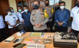 REPUBLIKA.CO.ID, DENPASAR -- Kapolresta Denpasar AKBP Bambang Yugo Pamungkas (tengah) menyampaikan keterangan pers saat pengungkapan kasus industri rumahan kue yang mengandung narkotika narkotika di kawasan Panjer, Denpasar Bali, Rabu (6/4/2022).