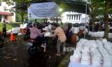 Relawan membagikan takjil gratis untuk mahasiswa di Universitas Muhammadiyah Yogyakarta, Sleman, Yogyakarta, Kamis (7/4/2022). Sebanyak 4 ribu takjil gratis disiapkan setiap hari untuk mahasiswa UMY. Usai Ashar mahasiswa antre mengambil takjil dengan membawa kartu tanda mahasiswa. (FOTO : Wihdan Hidayat / Republika)