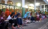 Warga bersama-sama menyiapkan mebu bubur sayur untuk buka bersama di Masjid Sabilurrosyaad, Kauman, Bantul, Yogyakarta, Jumat (8/4/2022). Setiap Ramadhan Masjid Sabilurrosyaad selalu membuat takjil khusus berbuka puasa yakni bubur sayur. Menu berbuka dengan bubur dengan krecek, telur, dan mi lodeh menjadi tradisi turun-temurun. Khusus setiap Jumat menu yang dihidangkan lebih banyak, hampir 300 porsi dan warga yang ikut berbuka di masjid juga lebih banyak. (FOTO : Wihdan Hidayat / Republika)