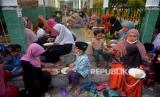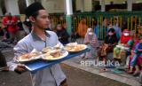 Warga membagikan bubur sayur untuk buka bersama di Masjid Sabilurrosyaad, Kauman, Bantul, Yogyakarta, Jumat (8/4/2022). Setiap Ramadhan Masjid Sabilurrosyaad selalu membuat takjil khusus berbuka puasa yakni bubur sayur. Menu berbuka dengan bubur dengan krecek, telur, dan mi lodeh menjadi tradisi turun-temurun. Khusus setiap Jumat menu yang dihidangkan lebih banyak, hampir 300 porsi dan warga yang ikut berbuka di masjid juga lebih banyak. (FOTO : Wihdan Hidayat / Republika)