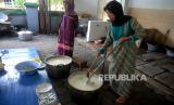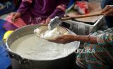 Warga mengaduk bubur sebelum disiiapkan untuk buka bersama di Masjid Sabilurrosyaad, Kauman, Bantul, Yogyakarta, Jumat (8/4/2022). Setiap Ramadhan Masjid Sabilurrosyaad selalu membuat takjil khusus berbuka puasa yakni bubur sayur. Menu berbuka dengan bubur dengan krecek, telur, dan mi lodeh menjadi tradisi turun-temurun. Khusus setiap Jumat menu yang dihidangkan lebih banyak, hampir 300 porsi dan warga yang ikut berbuka di masjid juga lebih banyak. (FOTO : Wihdan Hidayat / Republika)
