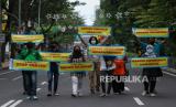 REPUBLIKA.CO.ID, SURABAYA -- Sejumlah aktivis lingkungan hidup membentangkan poster saat kampanye bahaya sampah plastik di hari bebas kendaraan bermotor di kawasan Taman Bungkul, Surabaya, Jawa Timur, Ahad (10/4/2022). Kegiatan yang digelar Komunitas Nol Sampah itu untuk memberikan pemahaman kepada masyarakat tentang bahaya sampah plastik terhadap lingkungan hidup serta mengajak masyarakat untuk menghindari penggunaan tas plastik (kresek).