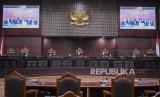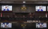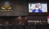 REPUBLIKA.CO.ID,JAKARTA -- Suasana sidang uji materiil Undang-Undang Nomor 7 Tahun 2017 tentang Pemilihan Umum terhadap UUD 1945 di Gedung Mahkamah Konsitusi, Jakarta, Senin (11/4/2022).