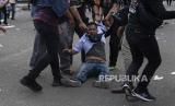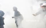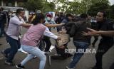 Sejumlah mahasiswa dari berbagai perguruan tinggi di Kota Palembang terlibat bentrok dengan aparat Kepolisian saat berunjuk rasa di simpang lima DPRD Provinsi Sumatera Selatan di Palembang, Senin (11/4/2022). (FOTO : ANTARA FOTO/NOVA WAHYUDI)