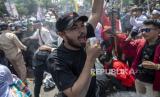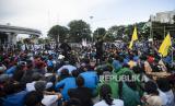 REPUBLIKA.CO.ID,PALEMBANG -- Sejumlah mahasiswa dari berbagai perguruan tinggi di Kota Palembang berunjuk rasa di simpang lima DPRD Provinsi Sumatera Selatan di Palembang, Senin (11/4/2022).