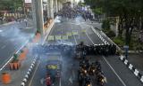 REPUBLIKA.CO.ID,MAKASSAR -- Anggota polisi menembakkan gas air mata ke arah pengunjuk rasa saat terjadi bentrokan di depan kantor DPRD Sulsel, Makassar, Sulawesi Selatan, Senin (11/4/2022).