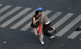 Anggota polisi mengamankan seorang pengunjuk rasa saat terjadi bentrokan di jembatan layang, Makassar, Sulawesi Selatan, Senin (11/4/2022). Bentrokan terjadi saat polisi berusaha membubarkan aksi unjuk rasa menolak menolak polemik Pemilu 2024, kenaikan harga bahan pokok dan BBM. (FOTO : ANTARA/Abriawan Abhe)