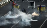 Anggota polisi menembakkan gas air mata ke arah pengunjuk rasa saat terjadi bentrokan di jembatan layang, Makassar, Sulawesi Selatan, Senin (11/4/2022). Bentrokan terjadi saat polisi berusaha membubarkan aksi unjuk rasa menolak menolak polemik Pemilu 2024, kenaikan harga bahan pokok dan BBM. (FOTO : ANTARA/Abriawan Abhe)