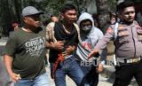 Aparat kepolisian mengamankan mahasiswa saat Aksi Demo 11 April di depan gedung DPRD Provinsi, Kendari, Sulawesi Tenggara, Senin (11/4/2022). Aksi demo 11 April tersebut berujung bentrok antara mahasiswa dan aparat kepolisiaan namun tidak terdapat korban jiwa. (FOTO : ANTARA/Jojon)