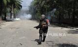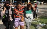 REPUBLIKA.CO.ID,KENDARI -- Seorang ibu rumah tangga dipapah aparat kepolisian saat terkena gas air yang ditembakan aparat kepolisian saat Aksi Demo 11 April di depan gedung DPRD Provinsi, Kendari, Sulawesi Tenggara, Senin (11/4/2022).