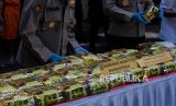 Anggota polisi menata barang bukti sabu-sabu saat konferensi pers pengungkapan kasus narkotika di Mapolda Bali, Denpasar, Bali, Selasa (12/4/2022). Ditresnarkoba Polda Bali berhasil menangkap tiga warga Bali yang menjadi tersangka kasus narkotika di wilayah Desa Kerobokan Kelod, Kuta Utara, Badung pada 8 April 2022 dan mengamankan barang bukti berupa sabu-sabu 35.166,00 gram netto, Kokain 32.00 gram netto, Ganja 2.669,40 gram netto, Metilendioksimetamfetamina (MDMA) dalam berbagai kemasan 1.488,36 gram netto, berbagai jenis Psikotropika 205.5 gram netto dan uang tunai sebesar Rp9 juta. (FOTO : ANTARA/Nyoman Hendra Wibowo)