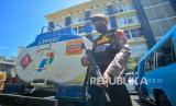 Petugas kepolisian berjaga di depan mobil tangki yang diamankan karena terlibat kasus penyalahgunaan pengangkutan BBM bersubsidi jenis biosolar, di Mapolda Sumatera Barat, di Padang, Selasa (12/4/2022). Ditreskrimsus Polda Sumbar mengamankan satu tersangka penyalahgunaan pengangkutan BBM bersubsidi untuk diperdagangkan kembali, dengan barang bukti diantaranya satu unit mobil tangki berisi 5.000 liter biosolar, 15 jeriken biosolar ukuran 35 liter, dan satu buah baby tank berisi 1.600 liter biosolar. (FOTO : Antara/Iggoy el Fitra)