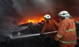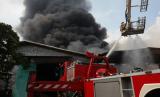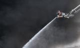 REPUBLIKA.CO.ID, SURABAYA -- Petugas Dinas Pemadam Kebakaran Kota Surabaya memadamkan gudang yang terbakar di kawasan Pergudangan Margomulyo Permai, Surabaya, Jawa Timur, Selasa (12/4/2022). Sebanyak 25 kendaraan pemadam kebakaran dikerahkan untuk memadamkan api yang meludeskan satu gudang penyimpanan barang elektronik serta kabel dan satu gudang penyimpanan sandal serta sepatu itu.