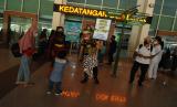 Relawan mengenakan kostum superhero membawa poster untuk mengajak warga agar vaksin COVID-19, di Bandara Adi Soemarmo, Boyolali, Jawa Tengah, Selasa (12/4/2022). Kegiatan mengajak vaksin COVID-19 dosis ke dua dan ketiga yang diselenggarakan Kodim 0724/Boyolali bekerja sama dengan PT Angkasa Pura I Bandara Adi Soemarmo itu bertujuan untuk percepatan vaksin bagi warga umum, petugas bandara, dan calon penumpang pesawat menjelang mudik awal Lebaran. (FOTO : ANTARA/Aloysius Jarot Nugroho)