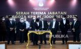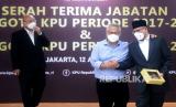 Ketua Komisi Pemilihan Umum (KPU) periode 2017-20222 Ilham Saputra menyerahkan buku memori jabatan kepada Ketua KPU Periode 2022-2027 Hasyim Asy (FOTO : Prayogi/Republika.)