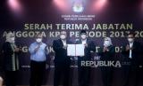 Ketua Komisi Pemilihan Umum (KPU) periode 2017-20222 Ilham Saputra bersama Ketua KPU Periode 2022-2027 Hasyim Asy (FOTO : Prayogi/Republika.)
