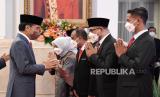 Presiden Jokowi (kiri) memberi ucapan selamat kepada Komisioner KPU dan Bawaslu periode 2022-2027 usai pelantikan di Istana Merdeka, Jakarta, Selasa (12/04/2022). Presiden mendorong Komisioner KPU dan Bawaslu yang baru dilantik untuk menyiapkan penyelenggaraan Pemilu dan Pilkada Serentak Tahun 2024. (FOTO : ANTARA /HO/Setpres-Lukas)