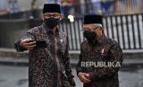 Wakil Presiden Maruf Amin (kanan) dan Menteri Pariwisata dan Ekonomi Kreatif (Menparekraf) Sandiaga Uno (kiri) berswa video usai membuka Gerakan Nasional (Gernas) Bangga Buatan Indonesia (BBI) di Bukittinggi, Sumatra Barat, Selasa (12/4/2022). Pemerintah menargetkan Gernas BBI dapat mengakselerasi transformasi digital UMKM, memperkuat kelangsungan usaha, percepatan perputaran siklus ekonomi, mendorong semangat bangga produk lokal, dan mendorong 'nation branding' produk lokal. (FOTO : ANTARA/Aditya Pradana Putra)