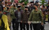 Wakil Presiden Maruf Amin (kanan) didampingi Ketua Dewan Komisioner Otoritas Jasa Keuangan (OJK) Wimboh Santoso (kiri) dan Gubernur Sumatra Barat Mahyeldi Ansharullah (kedua kanan) berjalan saat akan membuka Gerakan Nasional (Gernas) Bangga Buatan Indonesia (BBI) di Bukittinggi, Sumatra Barat, Selasa (12/4/2022). Pemerintah menargetkan Gernas BBI dapat mengakselerasi transformasi digital UMKM, memperkuat kelangsungan usaha, percepatan perputaran siklus ekonomi, mendorong semangat bangga produk lokal, dan mendorong 'nation branding' produk lokal. (FOTO : ANTARA/Aditya Pradana Putra)