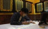 Perajin menebalkan pola untuk membuat kain batik bermotif ayat suci Al Quran di Mahkota Batik Laweyan, Solo, Jawa Tengah, Rabu (13/4/2022). Selain untuk menarik kunjungan wisatawan di kampung batik Laweyan, produk kain batik tulis bermotif ayat Al Quran tersebut dibuat sebagai mushaf untuk mengajak masyarakat belajar menulis, membaca dan memahami Al Quran. (FOTO : ANTARAFOTO/Maulana Surya)