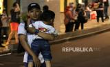 Warga berjalan keluar dari Tunjungan Plaza 5 yang terbakar di Surabaya, Jawa Timur, Rabu (13/4/2022). Sejumlah kendaraan pemadam kebakaran dikerahkan termasuk tiga Bronto Skylift untuk memadamkan api yang membakar lantai 5 Tunjungan Plaza 5 itu. (FOTO : ANTARA FOTO/Didik Suhartono)
