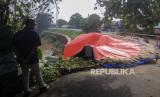 Warga melihat terpal yang menutupi longsoran tebing di kawasan Pengadegan Timur, Pancoran, Jakarta, Rabu (13/4/2022). Hujan deras yang mengguyur Jakarta membuat terjadinya longsor dengan panjang 25 meter, lebar 5 meter dan kedalaman 15 meter hingga menyebabkan sebagian ruas jalan harus ditutup. Republika/Putra M. Akbar (FOTO : Republika/Putra M. Akbar)
