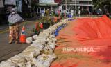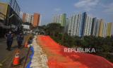 Warga berjalan di dekat terpal yang menutupi longsoran tebing di kawasan Pengadegan Timur, Pancoran, Jakarta, Rabu (13/4/2022). Hujan deras yang mengguyur Jakarta membuat terjadinya longsor dengan panjang 25 meter, lebar 5 meter dan kedalaman 15 meter hingga menyebabkan sebagian ruas jalan harus ditutup. (FOTO : Republika/Putra M. Akbar)
