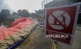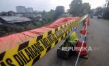 Garis larangan melintas yang terpasang di dekat terpal yang menutupi longsoran tebing di kawasan Pengadegan Timur, Pancoran, Jakarta, Rabu (13/4/2022). Hujan deras yang mengguyur Jakarta membuat terjadinya longsor dengan panjang 25 meter, lebar 5 meter dan kedalaman 15 meter hingga menyebabkan sebagian ruas jalan harus ditutup. Republika/Putra M. Akbar (FOTO : Republika/Putra M. Akbar)