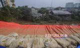 Terpal yang menutupi longsoran tebing di kawasan Pengadegan Timur, Pancoran, Jakarta, Rabu (13/4/2022). Hujan deras yang mengguyur Jakarta membuat terjadinya longsor dengan panjang 25 meter, lebar 5 meter dan kedalaman 15 meter hingga menyebabkan sebagian ruas jalan harus ditutup. Republika/Putra M. Akbar (FOTO : Republika/Putra M. Akbar)