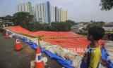 Seorang anak melihat terpal yang menutupi longsoran tebing di kawasan Pengadegan Timur, Pancoran, Jakarta, Rabu (13/4/2022). Hujan deras yang mengguyur Jakarta membuat terjadinya longsor dengan panjang 25 meter, lebar 5 meter dan kedalaman 15 meter hingga menyebabkan sebagian ruas jalan harus ditutup. (FOTO : Republika/Putra M. Akbar)