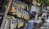 Perajin menjemur sajadah yang telah disablon di kawasan Kebon Melati, Tanah Abang, Jakarta, Kamis (14/4/2022). Menurut perajin pada bulan Ramadhan kali ini permintaan jasa sablon sajadah meningkat 50 persen dengan pesanan mencapai 20 kodi per hari yang dibandrol dengan tarif Rp 1.500 per sajadah. (FOTO : Republika/Putra M. Akbar)