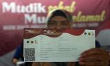 Calon pemudik Kementerian Perhubungan (Kemenhub) menunjukkan tiket mudik gratis di Kantor Dishub Kota Tangerang, Tangerang, Banten, Kamis (14/4/2022). Kementerian Perhubungan pada musim mudik gratis Idul Fitri 1443 H, menyediakan 350 armada bus untuk 8.100 penumpang arus mudik dan 240 penumpang arus balik warga yang berada di wilayah Jabodetabek.  (FOTO : Antara/Muhammad Iqbal)