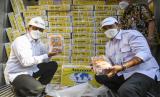 Direktur Utama Perum BULOG, Budi Waseso (kiri) didampingi Direktur Supply Chain dan Pelayanan Publik (SCPP) Perum BULOG, Mokhamad Suyamto (kanan) menunjukkan daging kerbau impor yang tiba di Terminal Mustika Alam Lestari, Tanjung Priok, Jakarta Utara, Kamis (14/4/2022). Pemerintah melalui Perum BULOG mendatangkan daging kerbau impor dari India untuk tahap kedua yang diperkirakan akan tiba sampai dengan lebaran mendatang sebanyak 36 ribu ton yang digunakan untuk alternatif pilihan bagi konsumen.  (FOTO : Antara/M Risyal Hidayat)