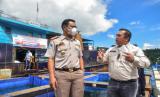 Kepala Balai Karantina Ikan, Pengendalian Mutu dan Keamanan Hasil Perikanan Ambon Hatta Arisandi (kiri) berbincang bersama Direktur PT Rajawali Laut Timur, Hasan (kanan) saat pelepasan ekspor ikan kerapu hidup PT Rajawali ke Hong Kong, di Teluk Ambon, Provinsi Maluku, Sabtu (16/4/2022). Kementerian Kelautan dan Perikanan melalui Badan Karantina Ikan, Pengendalian Mutu dan Keamanan Hasil Perikanan (BKIPM) menerbitkan sertifikat Cara Karantina Ikan Yang Baik (CKIB) untuk PT Rajawali sebagai perusahaan penerima pertama untuk industri keramba jaring apung di Indonesia, sehingga memangkas waktu layanan ekspor dari tujuh hari menjadi satu hari bahkan bisa hanya satu jam. (FOTO : ANTARA/FB Anggoro)