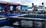 Sejumlah pekerja memanen ikan hidup dari keramba PT Rajawali Laut Timur untuk ekspor ke Hongkong, di Kota Ambon, Provinsi Maluku, Jumat (15/4/2022). Berdasarkan data Badan Karantina Ikan, Pengendalian Mutu dan Keamanan Hasil Perikanan (BKIPM), selama 2021 produk perikanan Maluku menembus pasar ekspor ke delapan negara, yaitu Jepang, China, Amerika Serikat, Vietnam, Hongkong, Malaysia, Singapura dan Korea, dengan komoditas unggulan seperti tuna nilai ekspornya mencapai 12,68 juta dolar AS dan ikan kerapu sebesar 1,5 juta dolar AS. (FOTO : Antara/FB Anggoro)