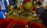 Sejumlah pekerja menyortir ikan hidup yang baru dipanen dari keramba PT Rajawali Laut Timur, di Kota Ambon, Provinsi Maluku, Jumat (15/4/2022). Berdasarkan data Badan Karantina Ikan, Pengendalian Mutu dan Keamanan Hasil Perikanan (BKIPM), selama 2021 produk perikanan Maluku menembus pasar ekspor ke delapan negara, yaitu Jepang, China, Amerika Serikat, Vietnam, Hongkong, Malaysia, Singapura dan Korea, dengan komoditas unggulan seperti tuna nilai ekspornya mencapai 12,68 juta dolar AS dan ikan kerapu sebesar 1,5 juta dolar AS. (FOTO : Antara/FB Anggoro)