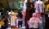 Pengunjung memilih pakaian di Pasar Beringharjo, Yogyakarta, Ahad (17/4/2022). Los pakaian Pasar Beringharjo mulai dipadati pembeli memasuki pekan ke-3 Ramadhan. Selain berbelanja untuk sendiri, pengunjung juga membeli pakaian untuk bingkisan lebaran Idul Fitri. (FOTO : Wihdan Hidayat / Republika)
