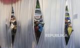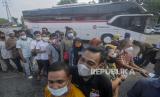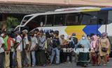Sejumlah warga mengantre untuk melaksanakan vaksin booster di Terminal Kampung Rambutan, Jakarta, Ahad (17/4/2022). Terminal Kampung Rambutan menyediakan posko vaksinasi booster yang diperuntukan bagi pengemudi bus dan pemudik yang akan pulang ke kampung halamannya pada Lebaran 2022. (FOTO : Republika/Putra M. Akbar)