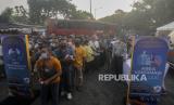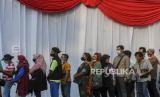 Sejumlah warga mengantre untuk melaksanakan vaksin booster di Terminal Kampung Rambutan, Jakarta, Ahad (17/4/2022). Terminal Kampung Rambutan menyediakan posko vaksinasi booster yang diperuntukan bagi pengemudi bus dan pemudik yang akan pulang ke kampung halamannya pada Lebaran 2022. Republika/Putra M. Akbar (FOTO : Republika/Putra M. Akbar)