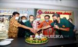 Pemotongan Tumpeng oleh ketua aktif dan mantan ketua Perhimpunan Amatir Foto pada peringatan 98 Tahun PAF di Bandung, Sabtu (17/4/2022). Klub foto tertua yang masih aktif di Tanah Air ini berdiri pada tahun 1924 di Kota Bandung. (FOTO : Dok PAF )
