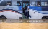 Bus melintasi genangan air saat banjir menggenangi Jalan Raya Dayeuhkolot, Kecamatan Dayeuhkolot, Kabupaten Bandung, Selasa (19/4/2022). Banjir akibat intensitas curah hujan yang tinggi dan meluapnya Sungai Citarum tersebut menyebabkan sedikitnya empat kecamatan di Kabupaten Bandung terendam banjir setinggi 50 sentimeter hingga 170 sentimeter. Foto: Republika/Abdan Syakura (FOTO : REPUBLIKA/ABDAN SYAKURA)
