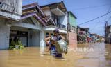 Warga menggendong anaknya melintasi genangan air saat banjir menggenangi Kampung Bojong Asih, Kecamatan Dayeuhkolot, Kabupaten Bandung, Selasa (19/4/2022). Banjir akibat intensitas curah hujan yang tinggi dan meluapnya Sungai Citarum tersebut menyebabkan sedikitnya empat kecamatan di Kabupaten Bandung terendam banjir setinggi 50 sentimeter hingga 170 sentimeter. Foto: Republika/Abdan Syakura (FOTO : REPUBLIKA/ABDAN SYAKURA)