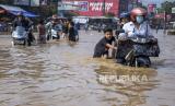 Sejumlah warga mendorong kendaraannya yang mogok saat banjir menggenangi Jalan Raya Dayeuhkolot, Kecamatan Dayeuhkolot, Kabupaten Bandung, Selasa (19/4/2022). Banjir akibat intensitas curah hujan yang tinggi dan meluapnya Sungai Citarum tersebut menyebabkan sedikitnya empat kecamatan di Kabupaten Bandung terendam banjir setinggi 50 sentimeter hingga 170 sentimeter. Foto: Republika/Abdan Syakura (FOTO : REPUBLIKA/ABDAN SYAKURA)