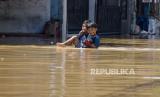 Sejumlah anak melintasi genangan air saat banjir menggenangi Kampung Bojong Asih, Kecamatan Dayeuhkolot, Kabupaten Bandung, Selasa (19/4/2022). Banjir akibat intensitas curah hujan yang tinggi dan meluapnya Sungai Citarum tersebut menyebabkan sedikitnya empat kecamatan di Kabupaten Bandung terendam banjir setinggi 50 sentimeter hingga 170 sentimeter. Foto: Republika/Abdan Syakura (FOTO : REPUBLIKA/ABDAN SYAKURA)