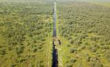 Foto udara kawasan Hutan Lindung Gambut (HLG) Sungai Londerang (kiri) yang ditumbuhi tanaman akasia dan kawasan hutan konsesi PT Wirakarya Sakti (WKS) (kanan) di Muara Sabak Barat, Jambi, Selasa (19/4/2022). HLG Sungai Londerang yang sempat terbakar pada 2015 dan 2019 dan berbatasan langsung dengan kawasan milik perusahaan pemegang izin konsesi hutan tanaman industri dan perkebunan kelapa sawit warga serta mendapatkan intervensi program restorasi dari Badan Restorasi Gambut pada 2017 itu kini telah ditumbuhi ekspansi akasia di sejumlah titik.  (FOTO : ANTARA/Wahdi Septiawan)