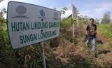 Seorang laki-laki melintas di samping plang Hutan Lindung Gambut (HLG) Sungai Londerang, Muara Sabak Barat, Jambi, Selasa (19/4/2022). HLG Sungai Londerang yang sempat terbakar pada 2015 dan 2019 dan berbatasan langsung dengan kawasan milik perusahaan pemegang izin konsesi hutan tanaman industri dan perkebunan kelapa sawit warga serta mendapatkan intervensi program restorasi dari Badan Restorasi Gambut pada 2017 itu kini telah ditumbuhi ekspansi akasia di sejumlah titik. (FOTO : ANTARA/Wahdi Septiawan)